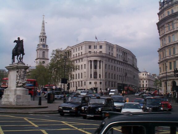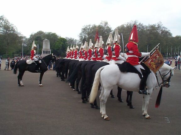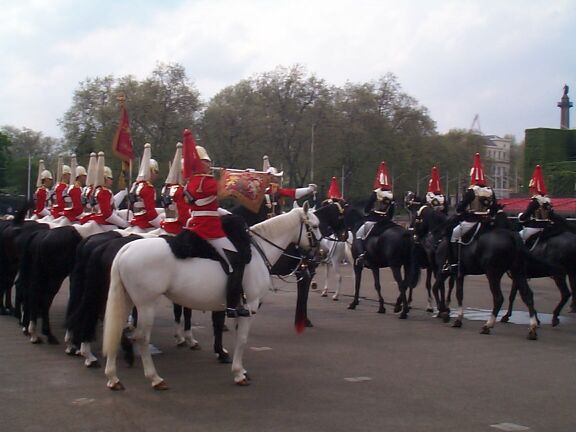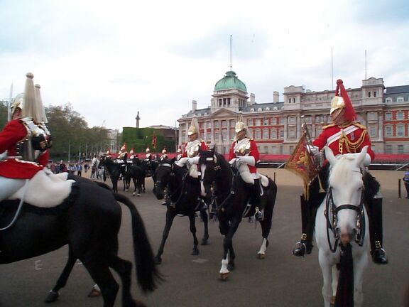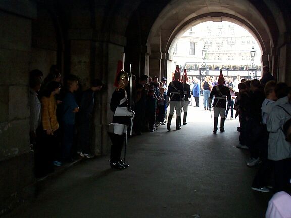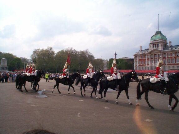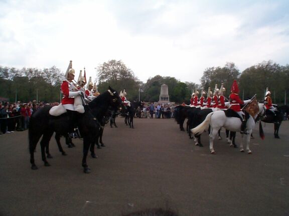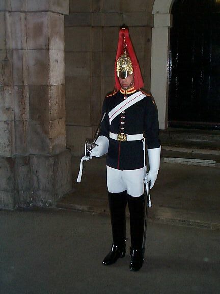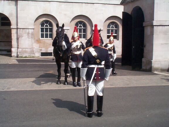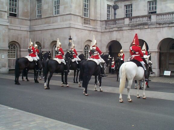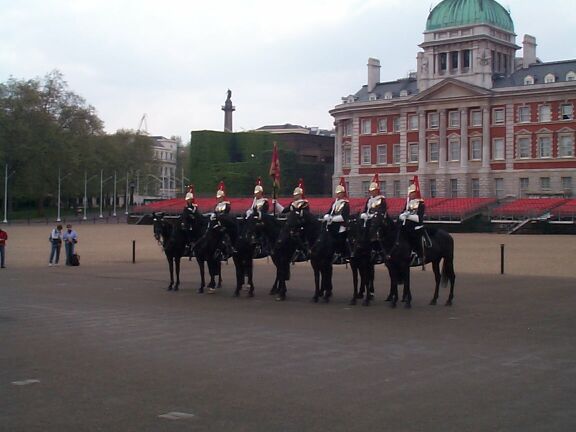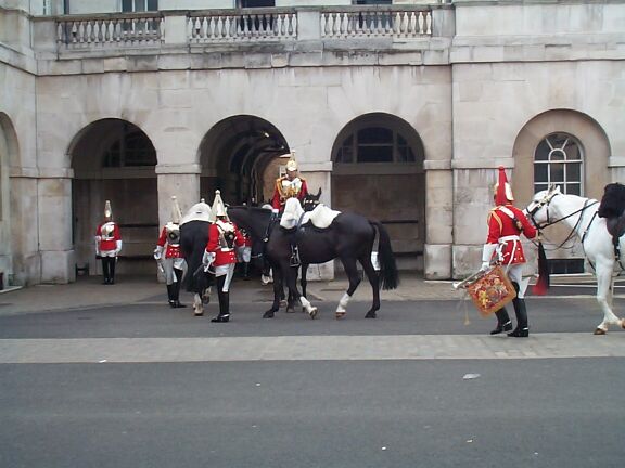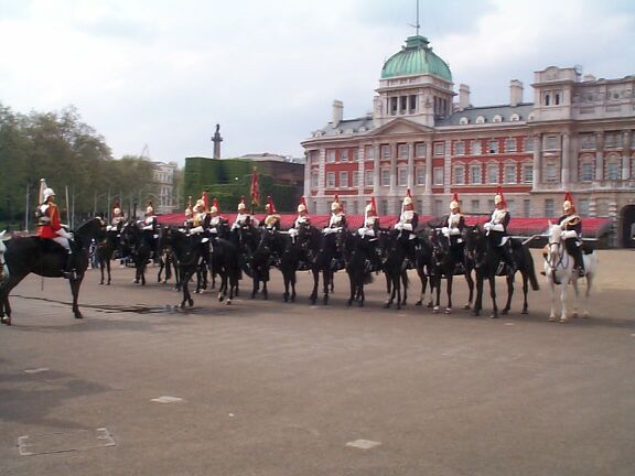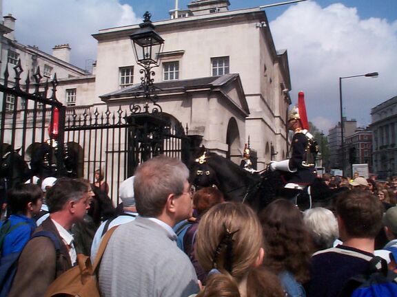 Coming out of the Abbey, I walked to 10 Downing Street - yet another disappointment, as one couldn't actually go to the door - all of Downing Street was closed at both ends by big gates. On to Trafalgar Square to take some pictures of Admiral Nelson's Column (which all turned out to be overexposed due to my stupid camera). Then rushed back to the Horse Guard's residence, where at 4pm the changing of the Life Guards took place. That took a helluva long time - the commanders of the two Life Guards were chatting for like 15 minutes before the other group arrived!