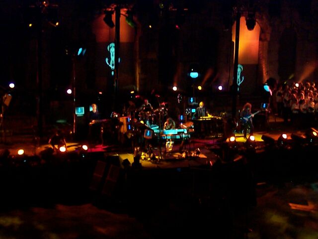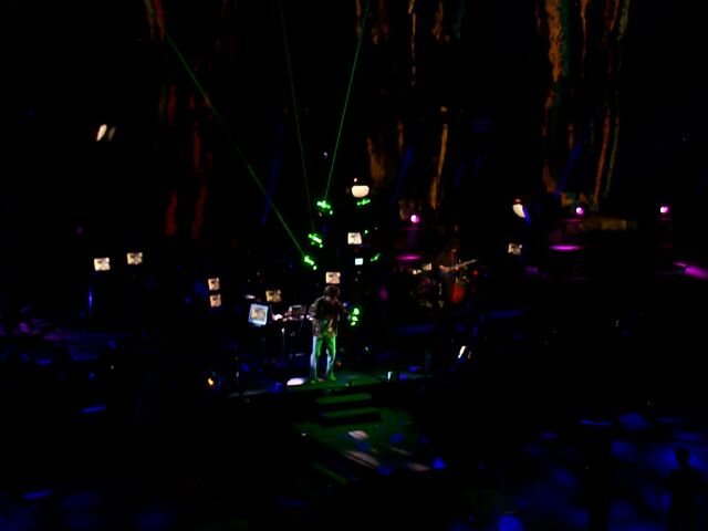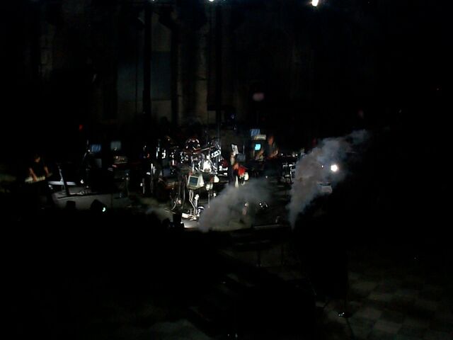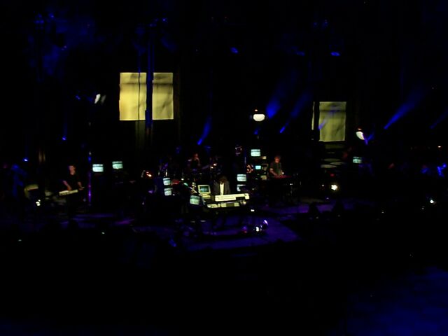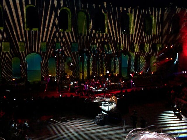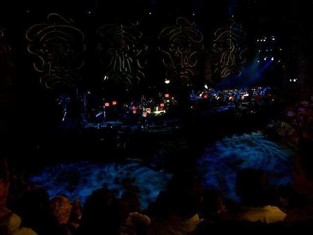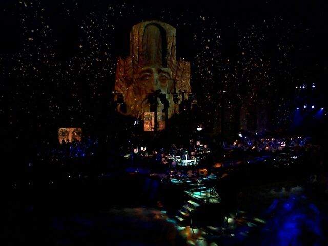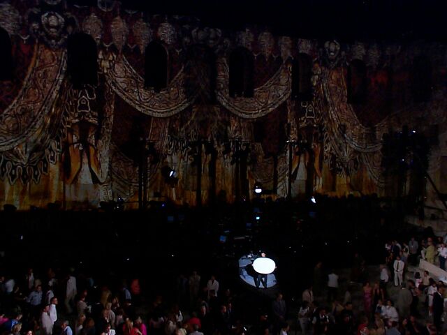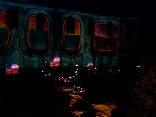 Intermission - the projected curtain is closed. The dude with the white oval is helping to adjust the cameras.