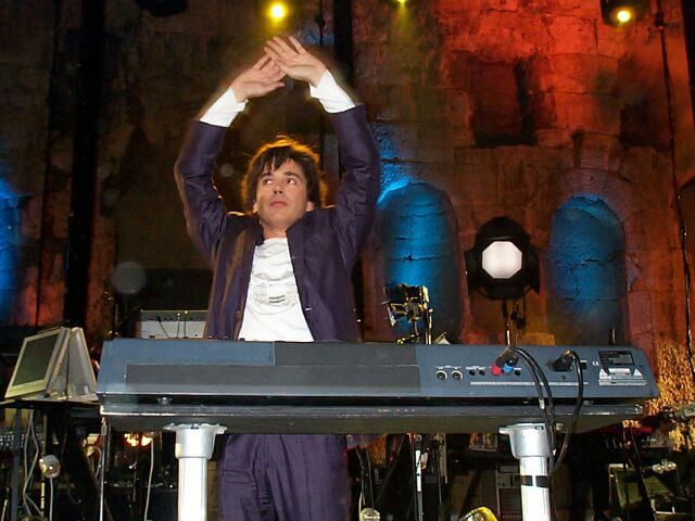 Jarre fiddling with his keyboard.
