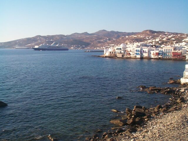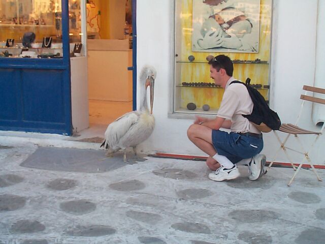 Pétros, the pelican, the island's mascot, just before he almost bit Jon. |
