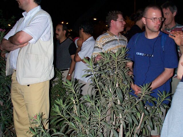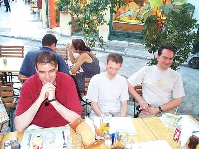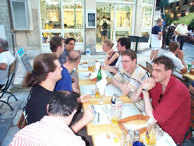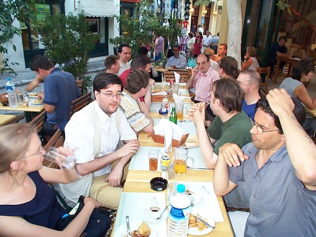 Back in Athens from my Delphi excursion, meeting my fellow Vangelis fans in the Pláka. To the right in red is Ivar. |