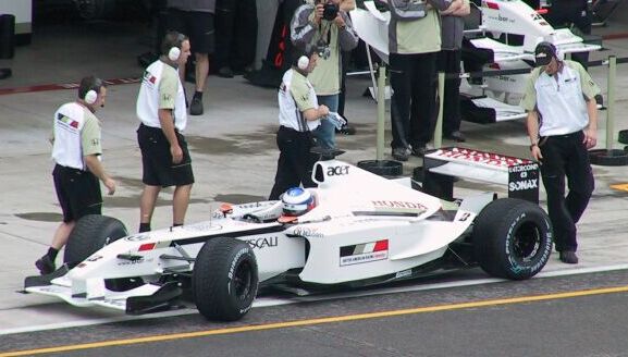 Rubens putting back the steering wheel after he hit the side barriers. |