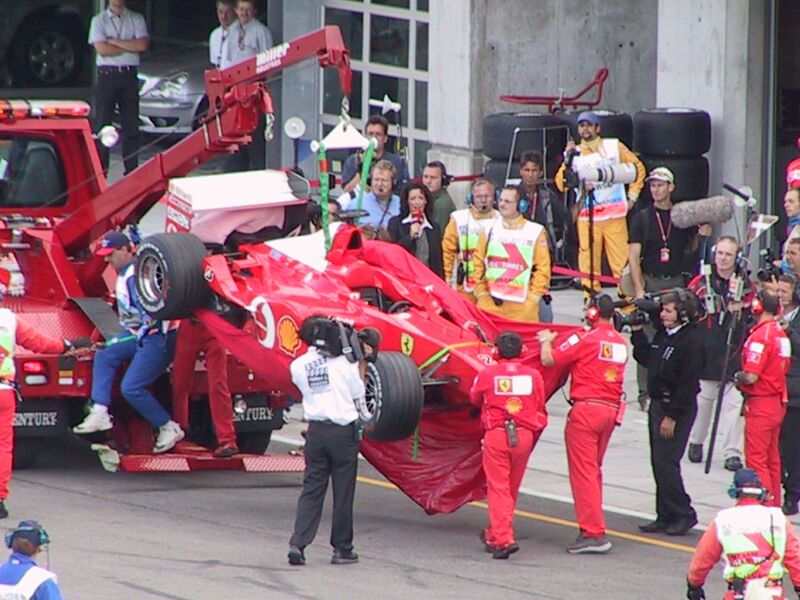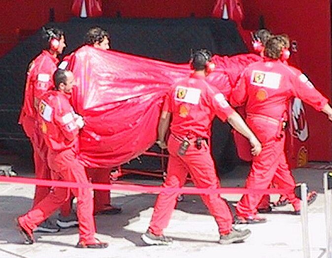 Ferrari's unsuccessful attempt at covering up the cut-up car. |