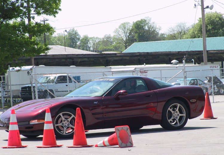 STOP! ... BTW, that's not a knocked over cone: it was basically an arrow telling us on which side to go around that cone. ... Also, note my front brake disc: either it got so hot during braking that it turned pink, or that's simply a reflection of the red cones in the brake disc. |