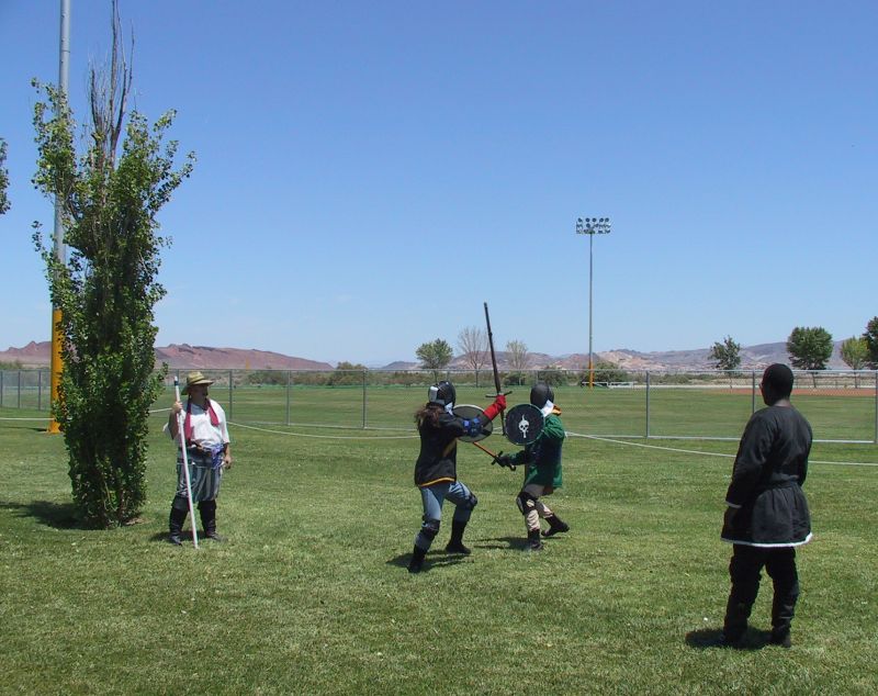Fighting with wooden swords.