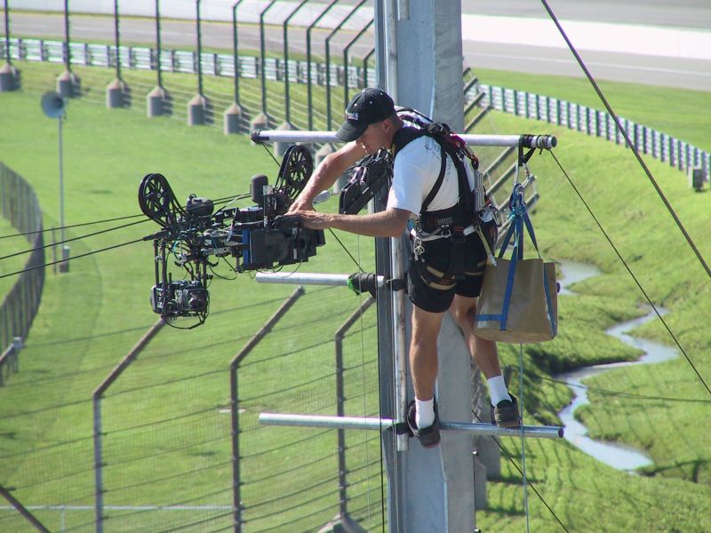 This is one very brave technician working high above on a high-tech camera that runs on a cable alongside the main straight.