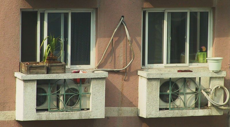 Our neighbors across the road, or: how the average Chinese lives in Beijing. Note the air-conditioning units in the balcony.