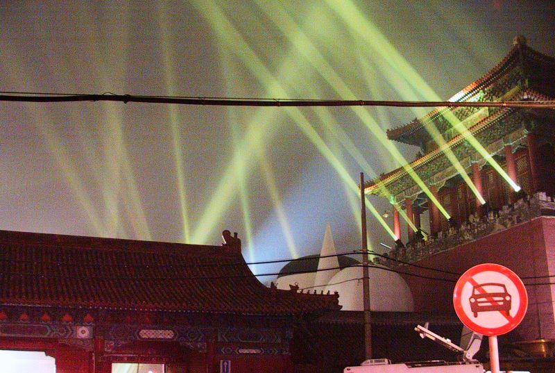 This is inside the Forbidden City (Imperial Palace) where we have tried in vain to get into the dress rehearsal for Jarre's concert. Actually, we had the contact info for a woman from Jarre's management team, but even though we left her a ton of voice messages at her hotel number, none were returned, and thus we had no special badges to enter the dress rehearsal. So, all I have from the dress rehearsal are pictures taken from the outside. Like this one. |