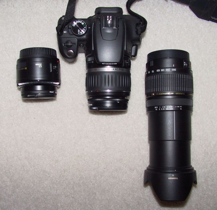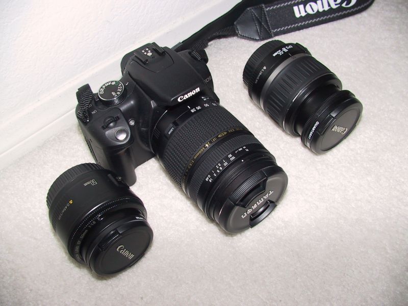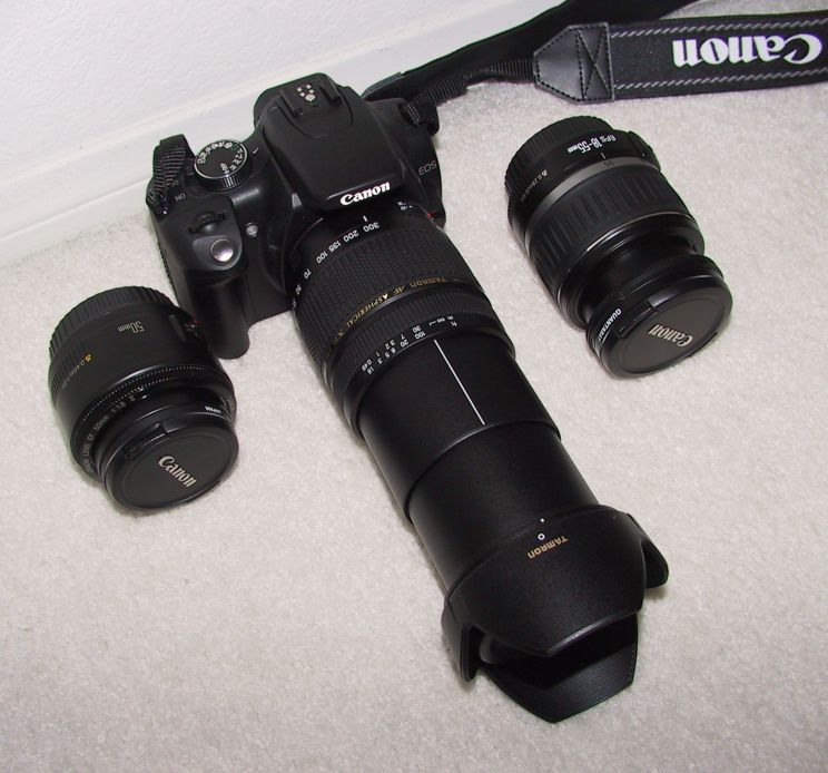 As for the lenses of my Rebel XT, each has its own use. The 18-55mm kit lens provides very good wide angle coverage @ 18mm. My 50mm lens has very good picture quality even at the edges (but that's expected, since it's a prime, ie. non-zoom lens) and it's really fast (f/1.8 is pretty fast, that lets in a lot of light in a very short time!). Considering it cost me only $70 (because it has cheap plastic housing), it provides the most bang for the buck of all the lenses I have. I am somewhat disappointed by the shorter focus range of my 28-300mm lens because of its relatively narrow angle of view, but even @ 300mm full zoom it has pretty good picture quality. Even though it has no image stabilization, I've found I can keep it fairly stable. We'll see if that will be true when I am shooting fast moving Formula-1 race cars...