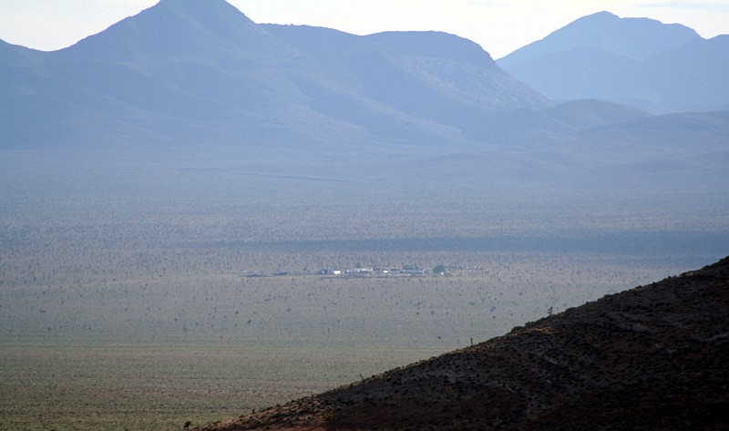 This complex by the dirt road leading into Area 51 is still on public land: it's the Medlin Ranch. Yes, somebody actually lives here. --- --- --- Canon EOS DIGITAL REBEL XT 1/320 seconds, F 1/7.10, ISO 100, focal length: 300 mm, flash: Not fired, compulsory flash mode