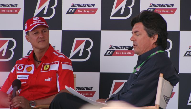 Bob Varsha interviewing Michael Schumacher at the public press conference.