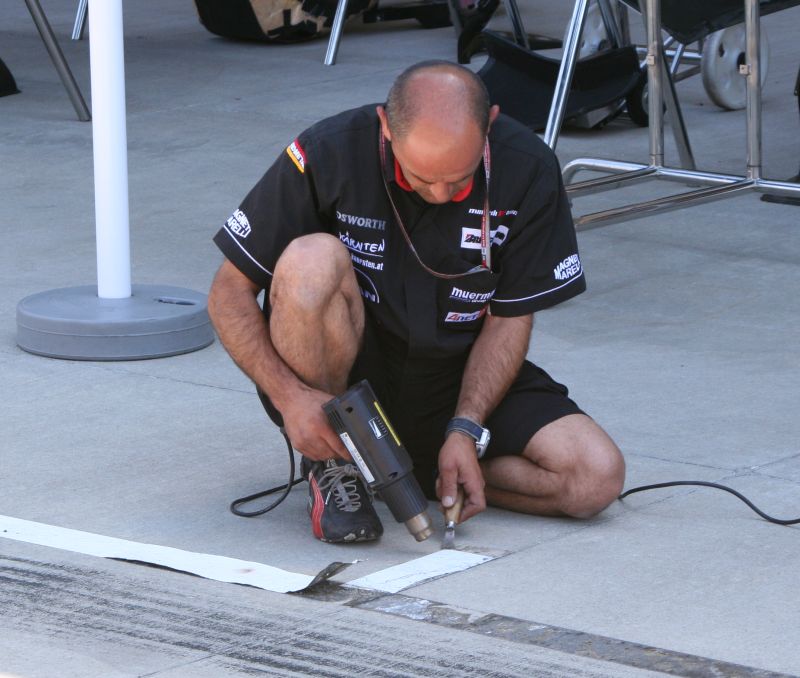 I have no idea why, but this Minardi dude was busy peeling off the tapes marking the pitstop location.