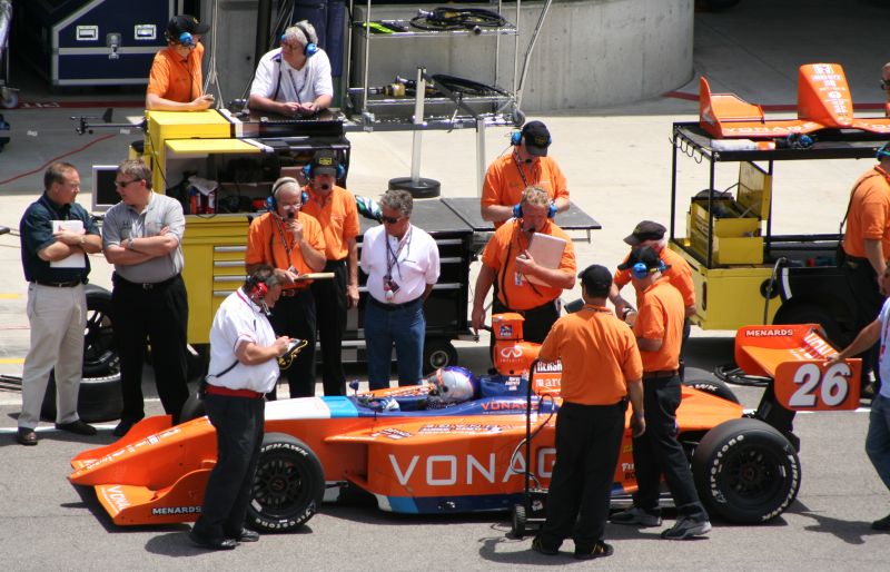 In the car: Marco Andretti. Behind the car: Mario Andretti.