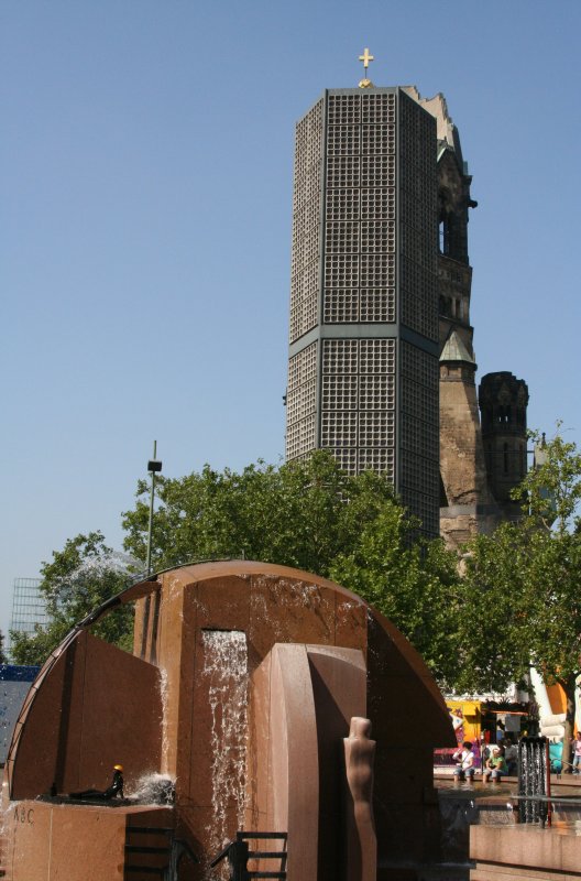 Looking at the new bell-tower - in front, the Europa Center's fountain.